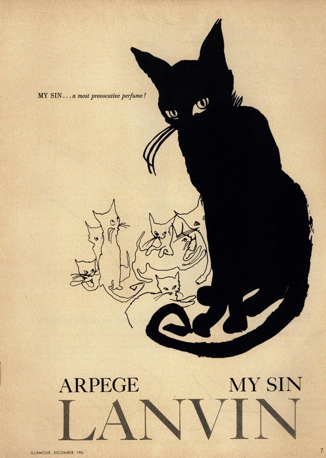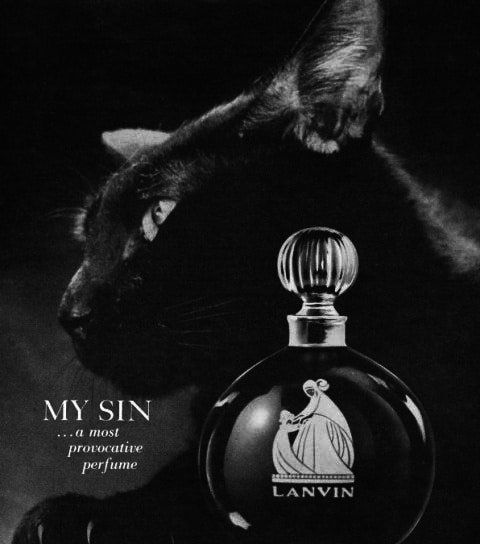 Meine absolute Lieblingswerbung ist und bleibt die von Lanvin zu My Sin, und zwar ziemlich egal welche, es gab etliche schöne, aber – die schwarze Katze muss dabei sein. Hier zuallererst einmal eine normale Werbung von Lanvin, in der sich die Franzosen als Katzenliebhaber zeigen: